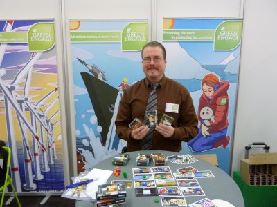 Well, this brings me close to the end of this last day at the SPIEL '12, since around 4 PM Nicole and I started visiting some booths to say goodbyes to our friends. However, on this tour we also went through the remote Hall 7 which we had not visited yet, and here we stumbled upon a small booth which displayed some interesting posters in the background. The graphics suggested that the game Proxy Wars would be dealing with conflicts between the industry and green activists, and since this theme actually interested both Nicole and me we approached the booth to learn more about the game.