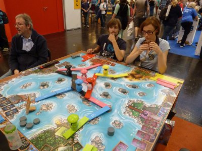 As you can see, River Dragons is a game where several playing skills come together. On the one hand you have an element of speculation, trying to forsee which cards will be used by your opponents in order to find a proper programming for your own character. On the other hand, the players also will need an eye for measures, since nothing is more unnerving than seeing a much needed plank go down the river because it was too short. Already these elements provide for a quite entertaining game, but it will get even more interesting when the players have played one or two games of River Dragons and begin to see the developments on the whole gameboard. Due to the rhythm of each player performing one action, several factors need to be considered especially when some characters meet in the center of the board, and here a bit of experience helps to prevent an unforeseen breakthrough of a character. All these elements make River Dragons a rather enjoyable family game, and Nicole and I had quite a bit of fun playtesting the game here at the SPIEL.