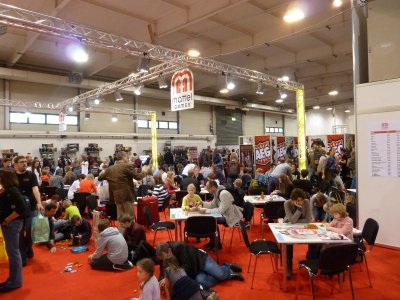 Having finished my lunch, I returned from home in order to meet with some friends from Cologne who come to the show each year in order to find some new games. We met in Hall 12, and they asked me whether I could point them to any game in special. However, with the schools having fall holidays this week, it was rather crowded in the convention halls, and so my friends were lucky to get four sets for a round of City of Horror which was played on an enlarged demonstration gameboard.