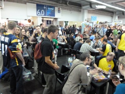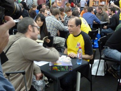 This first playtesting session took well after 11 AM, and shortly before that time a long queue of people was slowly building up in front of the IELLO-booth. All of them were waiting for the arrival of Richard Garfield, the designer of King of Tokyo, since he was giving out a very special promo-item for the game. In fact, he brought a stack of gamecards with just an image but a blank space for text, and Richard would put into this space a text describing whatever special ability this card was wanted to have. As it seems, this was a great idea!