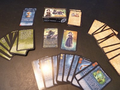 The outline given above has left out quite a few details of the full rules, but nonetheless it should be enough to give a general impression of the game's mechanics. Although the Lamont brothers couldn't resist to include the one or other pun in the rulebook, the game presents itself as a very mature and well-thought-out final product. At first contact I was having some doubts whether the different extra mechanics like the opaque bag and a movement related gameboard would fit well with a deck building mechanism, but gameplay revealed that these factors come together in a quite harmonious way. Even better, the game actually uses the deckbuilding mechanics on a common deck in order to implement cooperative gameplay, and seeing the ever-growing number of deckbuilding games where each player builds his own deck it comes as a refreshing variant that Spellbound challenges the players to participate in the building of a joint deck. Of course, like all cooperative games Spellbound also faces a possible Wisenheimer-problem because one player may try to dominate the others, and so each player should try to focus on the actions of their particular character, thus giving everybody ample of room to do their own thing.