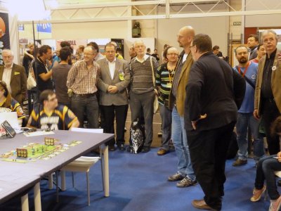 In fact, we have spent the whole day in the show, first playing games and later on saying goodbye to our various friends, whishing them a save journey home. Afterwards we returned home and Nicole prepared one of her fabulous chicken-apple-chutney dishes, and now I am strengthened for another night of wild typing. So, the result of our playtesting will be included in today's report, giving you an extremely interesting choice of a broad spectrum of games!