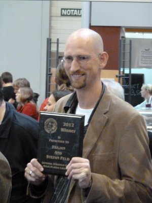 In absence of our chairman Greg Schloesser who had to stay at home in the United States, the awards once again was presented by Stuart Dagger. Even I had to play a minor role today, because Stefan Feld actually had asked me to serve as a translator, and so I did my best to reproduce his thanks to the jury for getting this awards. He said that he was really proud to get it, especially since it's an international awards which means that his game has been well received in quite a number of different countries.