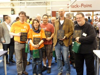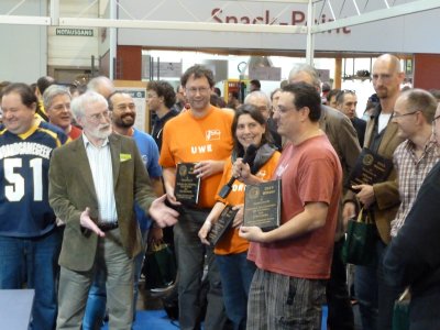 Standing in the back row you can see from right to left Knut Wolf, Andrea Ligabue, Ronald Hoekstra, Han Heidema, Ferdinand the Cassan, me and - just on the left - Stuart Dagger, whereas in the middle Stefan Feld, author of this year's winning game Trajan and Bernd Dietrich (AMMONIT SPIELE) were waiting for the ceremony.