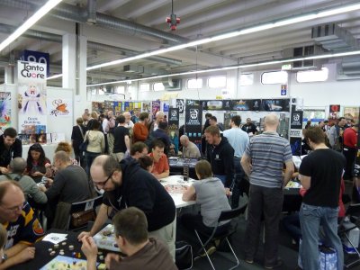Welcome back for my report on sunday, the final day of the convention. Although I have been looking forward to the fair for nearly a year, I am glad now that it will soon be over. As you can imagine, four days of walking through the halls, playtesting so many games and writing in the evenings is really exhausting. But one more report still must be survived. So I am back again to provide you with some more news about the games I tried today. Today I was happy to be joined by Lutz, a close friend of mine. Marco, our third Gamebox co-author also was attending today, but he brought along his son, so I did not see him much. Together with Lutz I began the day with a frantic gaming session at the QUEEN GAMES booth. Playtesting session: Escape (Queen Games, Booth 10-16)10 minutes, not a minute longer, is the time you have to escape a temple before it collapses (do you remember the first minutes of Indiana Jones - Raiders of the lost Ark?). That would not be difficult, but before you are able to do so, you must find gems that are widely spread in the temple. And if I say 10 minutes, then I also mean it. Escape is a real time game, which means that 10 minutes in the game are exactly 10 minutes in reality. So you will understand why I say the game is frantic. At the beginning of the game, we are equipped with five dice which we must use to walk around in the temple and to find the gems. The game is escorted by a soundtrack on CD which tells us when it is time to find the exit. ![]() During the game you should roll your dice as often as you can. To find the gems and to walk around we need given symbols on our dice. It is allowed to put aside any dice to collect the right symbols. But beware! Whenever you roll a black mask you are no longer allowed to use the die, until you have rolled a golden mask. Of course it is also possible, that you are blocked, because all your dice show you the black mask. Then somebody else must help you with his dice. So he must move to the room you stand in and must help you with golden masks rolled with his dice. As you can see, you better work in teams, because you are able to help each other with the dice. Two times in the game a gong sounds from the soundtrack. After the first gong, all players must move back to the main chamber of the temple. If someone is not able to reach it in time, he looses one of his dice, which is a great loss, especially in the end game. After the second gong, you must run to the exit. Hopefully you have found enough gems, because otherwise you won't be able for us to leave the temple in time. ![]() Escape is a cooperative game, so it can only be won if all players are able to leave the temple before the soundtrack comes to an end. The game concept is somewhat new, maybe a little bit comparable with Space Alert. I am not sure about how long the game is able to fascinate the people, but after your first game you want to try it once more, and after the second time once again. I think the success is that the game is very short, difficult enough that you will normally loose your first games and stressful, so that you forget everything that is around you. Already some expansions are available, so you can add traps and other nasty things to adapt the game to your growing experience. We will see if the game is able to stay on the top in the next year... After we were successful in our third game, we left the booth and did not have to drink a coffee like we had planned before. Our adrenalin was high enough, so we could immediately start another playtesting session. Playtesting session: Helvetia Cup (Helvetia Games, Booth 7-104)As promised after my first day, I came back to the Swiss publisher to play a round of soccer. In Helvetia Cup two fantasy teams compete against each other. The one is represented by small dragons, the other by a herd of freaks. Both players get four players and a goalkeeper. All players have individual values for their abilities to play a pass, dribble, do a tackling, shoot and other important things for soccer. First thing to do in a round is the moving of your players. The attacker always begins. One step of each player is for free, if you want run longer, you must spend of your player's boost ability. But you should be careful, because if this is reduced to zero, all other abilities are reduced to the half of their normal values. If, after the movement phase the Defender has a player on the same hex-field as an opponent with the ball, he may try to steal the ball or to tackle the other player. To see if this is a success, you must roll against your abilities with a D20. Against some attacks the other player can play a counteraction, but again he has to check if this was a success with the help of a die. If after this defensive phase the attacking player is still in ball possession, he may try to shoot or to pass the ball to another player. ![]() The difficulty of the shot depends on the position of the player, the player's offensive ability and the distance to the goal. First we have to check if the goalkeeper is able to seize the ball. For this both the attacker and the defender secretly choose one of the six squares of the goal. The attacker always chooses one square, the defender may do so for as many squares as the distance from the goal to the attacking player. Then the choiced made by both players are revealed. If the goalkeeper did choose the right square, he has catched the ball. If not, the attacking player still has to roll against his ability for shooting. The game includes a lot of details of a normal soccer match. So, for example it is possible to try a header, and of course there is also the offside rule. Special abilities can be won in a Cup game. For this you play several rounds and you can improve your team with some special cards which you can use in the following matches. The game works very well and is also a lot of fun. The playibg material is of high quality and especially the miniatures of the players 