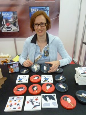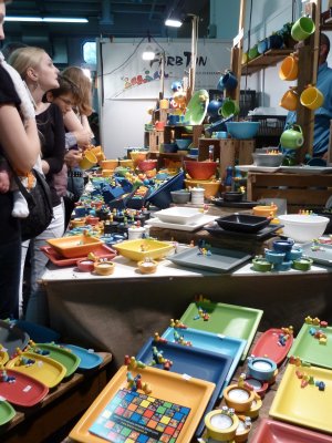Another cute find which we made in Hall 9 was at the booth of FARBTON KERAMIK, a pottery workshop which has specialised in doing gamer's choice pottery producs. So, you could get colourful cups, bowls, dishes, and as a special attribute some differently coloured meeples and pawns had been added to the design. A quite nice table-decoration for a gaming evening!