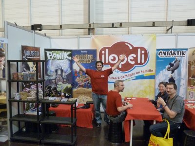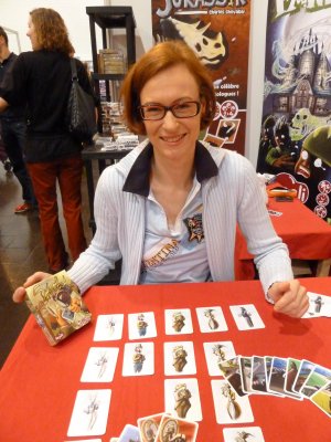 However, as promised the day was not yet over for Nicole and me, and so we continued our trip into the great unknown, meaning that I once again did Nicole take the lead in order to discover something new! So, we ended up in Hall 4 at the booth of ILOPELI, yet another French publisher of small cardgames. Nicole actually had been attracted to this booth by the cute looking games' artwork which was displayed on big posters at the back of the booth. We ended up trying a game of Sherlock, a cooperative cardgame which uses cute character artwork of animals.