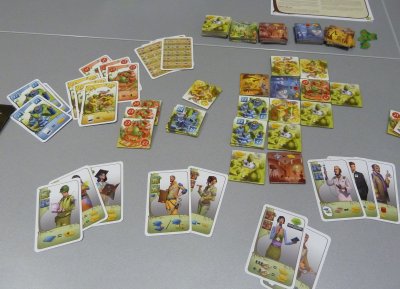Each player now secretly chooses one of the animal cards on his hand, and then all chosen animals are revealed at once and placed on the board. Then the situation on each board will be evaluated, and a player now may take all the dice from an area if he has played the card of an animal which is one step higher in the food chain, e.g. a player whoe has played a rabbit may take all carrot dice. If more than one player have chosen the same animal, the dice will be evenly distributed among all participating players, with eventually remaining dice staying on the gameboard.