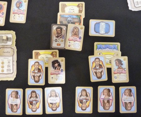 At the beginning of the game this process is rather short since all 8 Courtier cards in the players' decks are identical, but during the course of the game the players will hire additional Magisters which will replace the Courtier cards in their decks. Apart from the fact that Magisters are more valuable when it comes to paying for making a placement at a municipal building, each of the four available types of Magisters also has a special ability which comes to bear when the Magister is used to make a placement: