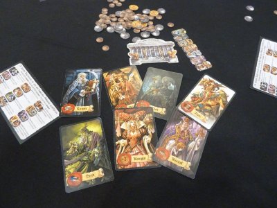 After that we secretly one by one choose a place we want to visit in the round. For this we have tokens of every place and we secretely choose one. After a command every player reveals where he plans to go. If there is only one player who chose a place in that turn, he places a cube on the next free position at this place. If however there are two or more players who have chosen the same place at the same time, the order is determined by an order track, that is set at the beginning of the game. The order on this track can be changed in another of the places. After we all secretly have chosen four places we want to visit and have revealed the places and thus determined the order of the players at every place, the places are dealt with in the order we have determined before. In some places we can buy new items to improve our skills (mental and physical), get protective cards to take with us into the fights or to increase our machine power (to take more cards into fights and to get better prices when selling items). But the cards must be paid, so there is the possibility to go to a kind of bank to get some more money, too. At this place for example the order of the players determine how much money a player receives. Fightings take place in another place where we go on missions. These missions are extremely important to win extraordinary power and additional money. In the fights we first choose which protective cards we take with us (up to the number of our actual limitation). Then in most cases trap cards are drawn to determine the final attacking level of the physical and mental power. We can use our protective cards to block those attacks, but if this is not enough we must take the damage to our retriever. In case of a success, if we did not reach our limit of physical or mental points, we are rewarded with new items (that can be sold immediately instead of taking them), knowledge points and - if we are lucky - tree points. Those tree points can be very important to end the game early, because four tree cards in one hand determine the winner, too. Of course there are also healing potions to buy to regain mental and physical power. ![[SPIEL]](ral13005.jpg) Another important place we can visit are tree cards, where we can do some additional actions and can exchange our knowledge points into victory points. Each round a different tree card is dealt with and there are more cards than you use for one game. At the beginning we randomly draw tree cards for this game, so each games differs from another slightly. The game ends after the fifth round or if one player has collected four of the tree cards. When I first saw Enclave: Zakon Kranca Swiata it seemed much more complicated that it was in the end. It is the great board that evokes a feeling of complexity. But in the end it is all about choosing to where you are going and fulfilling the available actions in the places. Although I expected something totally different, I liked playing the game. Together with Bartosz I did a two-player game. That was OK for learning the game but I think the game is designed for three or four players. In that case the order of the players at the various places is much more important. If you see an item in the outlay you want to buy, you should choose this place very early, otherwise another player could be faster and take it away. It is the same with the tree cards. There is only a limited number of knowledge tokens we can exchange for victory points in a round. So when the guys before you had already exchanged too many tokens, you won't have the chance to exchange more of them. Enclave: Zakon Kranca Swiata looks great and is also a very nice game, but I think it won't please everybody. Probably it is especially interesting for players who like games with a great story, great illustrations, but without too much complexity. I also think that if you are familiar with the game it can be played very fast. I really would like to play the four player variant to tell you more about the game, but for today I had to hurry up to do my final playtesting. ![[SPIEL]](ess13065.jpg) Finally for this day I went to the booth of CGE, where I have been yesterday already. This time Vít Vodicka was prepared and had reserved one of his tables. Playtesting Session: Tash Kalar: Arena of Legends (Czech Games Edition, Booth 1-D140)