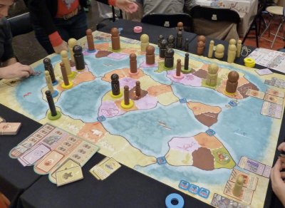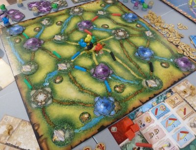 A third type of action available to the players is "swapping", but behind this term hide the real conflicts in the game. So, a player may make a migration-type movement into a region already occupied by a different player's village and pawn, and if the active player has a stronger (bigger in width) pawn than the current inhabitant of the region a swap will be initiated, forcing the village and pawn of the current inhabitant to go back into the region where the active player's pawn came from. This type of action allows a player to get strategic control of important regions, so that the valuable Straits tokens can be collected or continents can be sealed off.