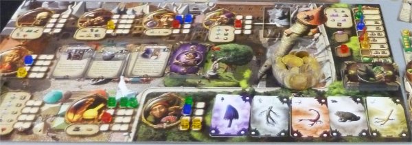 At this point a game which may initially have sounded like a simple placement game gets tricky and fascinating at the same time. Not only the aforementioned rule for the scoring of village-features forces the players to diversify, but also the nature of the Aspect cards which can be earned by these evaluations. Each Aspect card either can be used for placing an additional building, shrine, oven etc., or it may be collected to get more cards of the same feature in order to discard them together to gain victory points. The bigger the group of cards discarded, the more victory points can be earned. However, both usages of the Aspect cards face a hard limitation, and so a player only can use as many Aspects cards each round as he has families (i.e. buildings in different villages). So, a player who focuses on just a few villages will not be able to play/discard many Aspect cards, and this would cut him off from the most important source of victory points.
