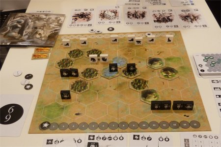 Even though the gamebox is quite small, the game comes with a high amount of playing material, including the aforementioned mission cards and even some special leaders for each side. As I could experience today, the battles can be quite brutal if a players takes too much of a risk, because the opponent will score the purchase value of each destroyed unit. If a certain threshold is reached, the game is over, and due to my careless advance Nicole gave me a quick and merciless 12 to 3 beating. Well, I hope to take revenge during our next game at home!