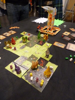 Well, today actually one thing has been planned in advance, and this was our first game of the day. Nicole wanted to play Dragonscroll because of the rather cute Dragons and the unusual tower, and so we spent our first visit to the booth of FRAGOR.