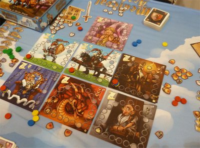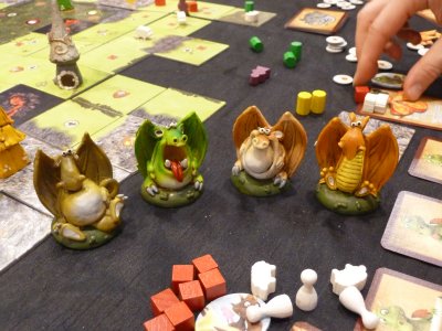 Defeated foes can be collected, and they can be used either for increasing the Dragon's strength (more fireballs!) or for fulfilling "Munching"-quests on special Dragonscroll cards. Each player starts with three of these Dragonscroll cards, and additional cards can be acquired during the course of the game. If the player hands an amount of defeated foes which matches the requirements of one of his cards back to the stockpile, he may place this card beneath his Dragon's character card, continuing his storyline and counting as victory points by the end of the game. Two more types of Dragonscrolls exist, and these are "Discovery" cards which the player can score by completing landscape formations, and "Fireball" cards which require a certain number of foes to be defeated in just one turn. If fulfilled, these cards can be revealed and scored as well. Coincidentally, this triple way of scoring resembles a bit of the landscape, growing and eating scoring possibilities found in Takenoko, but this similarity is only superficial because the scoring options have been embedded in a quite different playing mechanism. A quite cool "Lamontish" idea is the fact that each fulfilled card is placed beneath the player's Dragon to reveal a piece of story, and at the end of the game each player's Dragon will have developed a quite various storyline.