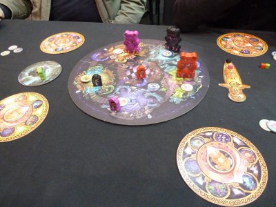 Scouting the much less crowded halls to an overview, the directly the next game which Nicole wanted to play was something quite typical for her taste: cute graphics and an unusual theme compelled us to test The gamebox promised a rather short playtime, and indeed a four player game justs lasts for about 20 minutes. Before the game can start, three ingredient tokens are placed into each of the six places on the gameboard (all of which are part of an ancient University for Sorcery), and in addition some outlying places with additional ingredients are placed next to the main gameboard. Each place contains different ingredients, but all ingredients at a place are of the same kind. The victory conditions sound quite easy: By the first to collect four different ingredient tokens, wake up the Great Octopus and become his favourite minion.