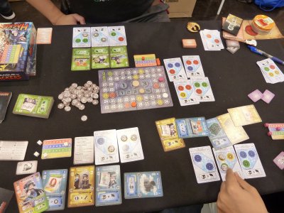 I have spent the 45 minutes collecting games, some of them preordered and some of them probably in high demand. A few days ago I had printed out the hall plans in order to find the most efficient route for this exercise, and I was amazed that it worked for me to visit half a dozen booths during that time. Then I made it for one of the entrances to meet a fellow gamer, and I traded a copy of Airlines Europe to get a copy of Space Cadets Dice Duel. I am not sure what to expect of this game, but my copy of Airlines hadn't been played for a long while so I decided to make this deal. I hastened home, dumped off all my purchases and was back in the halls right at 11 AM for my first meeting. This was nearly record-breaking!