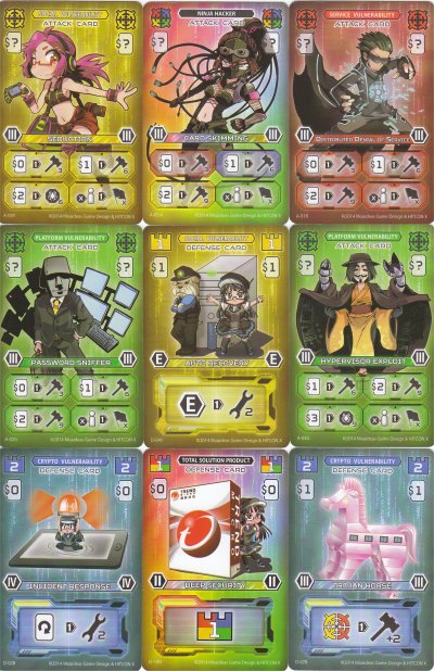 As said, Attack cards will be used to distribute damage tokens onto the holes in the other player's servers, and the color of the holes attacked depends on the color of the used Attack card. However, a cautious player may have installed some Defense cards, and these cards will give him a defense capability for one or more colors. The strength of an attack always is modified by the victim's defense capability of the same color, and only excess damage will be placed on the victim's server. All Defense cards remain permanently with the player who has installed them, and apart from increasing the player's defense capability these cards also list special card effects which are useful for the actions of the card's owner. So, each "Incident Response" card owned will increase the efficiency of a Mitigation action, whereas a "Trojan Horse" will increase the amount of damage dealt during an attack which uses a color specified on the card. "Auto Recovery" cards on the other hand will allow their owner to reduce server damage by the end of the round, and "Deep Security" increases a player's defense capabilities in all colors. Ten different types of Defense cards exist in League of Hackers, and the players are challenged to install a wise combination which protects their servers and boosts actions against other players at the same time.