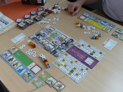 For some years I have been looking for a good civilization-type game which is light and small enough to serve as a travel game but which still offers the players an interesting choice of options and some possibilities for real decision making. At first sight I thought that Roll through the Ages would serve this purpose, but the game actually offers no real player interaction and it can have some downtime especially in a four-player game. Rustan Hakansson Nations The Dice Game not only solves the problem of downtime by implementing the playing-sequence of Nations with one action per player, but Rustan actually succeeded creating an almost perfect strategic dicegame. Of course there is some luck involved, but the players still have a quite high degree of control over their actions by the enhancements they can obtain during the game, and so luck isn't the end of the story. In addition, the game plays incredibly fast with Rustan and me needing approx. 40 minutes to play a full game on friday, and this short period of time has been so action-packed that time virtually has flown by. For me all this a strong indication that I have sampled a rather addictive game, and indeed I cannot really wait for the next possibility to play it again!