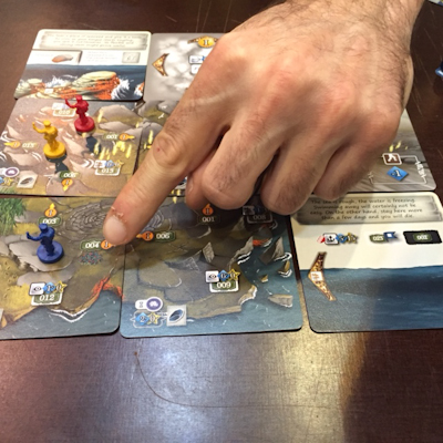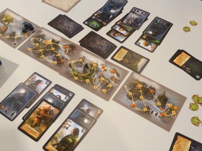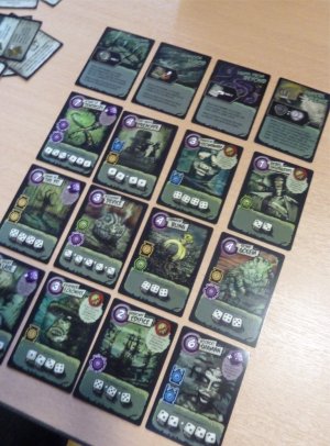 As can be suspected, the Hero and Curse cards are not the only cards forming the three card rows, but during the course of the game the players will add Enemy cards appearing on Fog cards, allies or useful equipment, and all these cards will be added to the back of the card row from which the top card has been used for the player's current action. This way the card rows will get longer, challenging the players to coordinate their cardplay in order to run the game efficiently.
