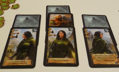 Each player begins each stage in possession of three Hero cards showing his chosen character in three different poses. These cards will be placed next to each other in front of the player, thus marking the beginning of three individual card rows held by each player. Behind each Hero card, with a slight shift to remain partly visible, a randomly drawn Curse card will be placed, and apart from some Will-point markers these sets of six cards per player are all they get to start on a stage of the journey. Both Hero figures then will be placed on their starting positions on the first of the four Adventure cards, and the game begins with the first player turn.