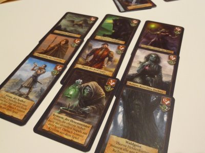Using a mechanism similar to the one Gerhard Hecht had employed in Kashgar: Händler der Seidenstraße, during their turns the players always are obliged to use one of the three cards at the beginning of one of their card rows. During the first turn of each player this will be one of the three Hero cards, but after the card is used it will be moved to the end of its row, now moving all cards which have been behind one step forwards. During the start phase this means that one of the Curse cards now will be the top card of its row, and sooner or later the players will have to play one of their Curse cards in order to get back the Hero card behind it.