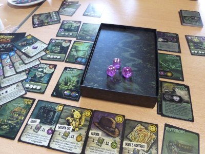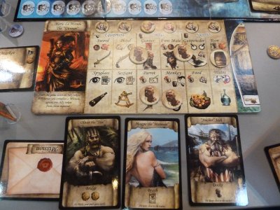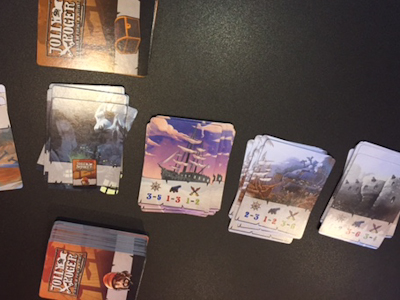 The game is over when most bandits have been defeated, when most trading ships (to which resources can be delivered for victory points) have left the harbor, or when the deck of Location cards has been exhausted. Now the players will add up their victory points from locations, ships, bandits and tokens gained during the game to determine the winner.