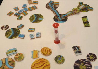 Taking turns, the players have to place River blocks from their stockpiles to build up the river, and they will strive to include elements of scenery in order to take pictures. Some of the River Blocks show a photographers' icon, and if such a Block is placed the players can try to include these scenery elements in their buildup, but with the requirement that only Blocks belonging to this type of landscape may be used for placement on the scenery boards. In likewise fashion, the players also can take pictures of animals, placing the animal disks on top of fitting River blocks which have been placed after a camera.