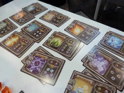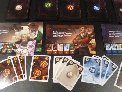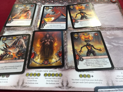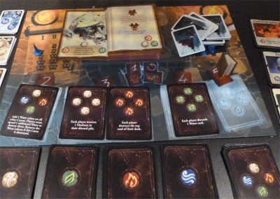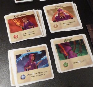 The Element cards on the players' hands will be used to power spells. At the beginning of the game each player is assigned an identical set of four beginner spells, and these spells offer some basic functions like drawing an additional card, destroying a hand card (possibly a Madness card) or allowing another player to perform an action out of turn. However, there also exists an open display of 4 spell decks belonging to the 4 elementary schools, and the players also can use Element cards from their hands to purchase new, more powerful spells from these decks, replacing some of their older spells when they have reached a total of 5 available spells. As indicated, the spells which can be bought during the game are far more powerful, allowing combinations of the basic actions and positive effects for other player characters. In addition, the spells usually have a variable efficiency, allowing a player to overpay the Elements needed to cast a spell by two or even three times. If such an overpayment is made, the spell's effect is doubled or tripled, and this allows the players to make some quite interesting decisions when enhancing their character decks with new Element cards.