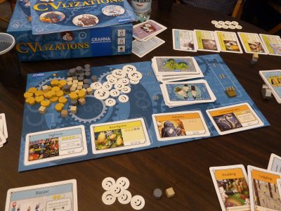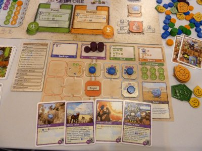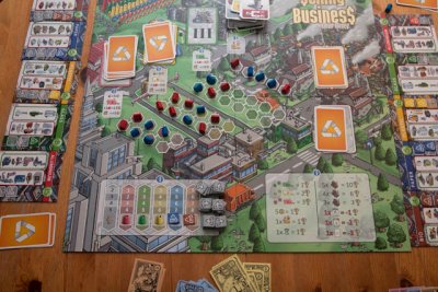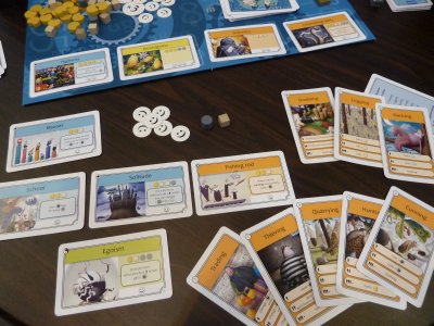 The intelligent usage of the locations is the key element of the game, since the relatively high pace on which the game advances does not really pardon major timewasting. So, the players need to generate resources in order to purchase new location cards from an open, partly random display, and as explained these newly bought locations then will be used to cover already existing locations on a player's City board. As a rule, the new locations have better abilities than the starting locations, so that the players may produce more resources etc.. In addition, the new locations usually will count for some victory points which the owning player can take into his calculation when the game is over
