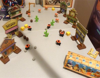 Movement and shooting of the individual cowboys is done by shooting (snipping) wooden disks on the table, with the disk being replaced once more by the playing figures at their final stopping place. When the disks hit an obstacle, the player's turn is over, but otherwise he might have another action, using a smaller disk which is placed next to his cowboy to shoot someone. The shot is successful if the target meeple is knocked over, loosing him a precious lifepoint.