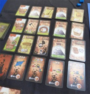 Taking turns, the players now have to assign two of their Army cards to one or two of their neighbouring Landscape cards during their turn. Some of these Army cards will be placed openly, whereas others can be placed faced down, leaving the opposing player(s) to speculate which card the player might have used for this placement. When all Army cards have been placed, all cards will be revealed and battles will be carried through for each Landmark card, with the card going to the player who has placed Army cards with a higher strength value on his side. However, the battle is the place where the special abilities of some army cards are triggered, and these abilities may give a player a quite decisive advantage. So, a Samurai card actually will remove some opposing units before the strength values of the cards are compared, but on the other hand the Samurai can be countered by the Archeress, removing the Samurai before his ability comes to bear. Quite strong is the player's Warlord card, since it will add one additional Strength point for each Army card which has been placed at the same Landmark card afterwards.