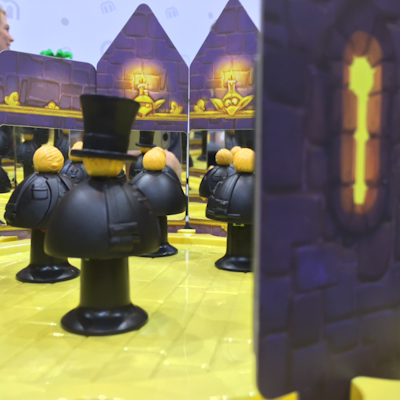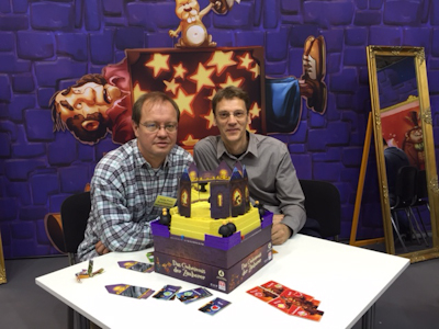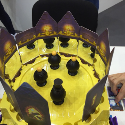 In the game the players are magicians who gather together to decide who of them will be worthy to enter the fraternal order. For this the young magicians must pass a test. One by one they have to go to a hall of mirrors and all other magicians must try to discover the magician's secrets. But they may not be distracted by all the illusions they see in the mirrors. The game is very material-intensive. The walls of the great hall of the game consists of 12 mirror walls that are put into slots of a castle that is put on top of the box of the game, so that everyone has the game at eye level. On the inside of the wall tiles there are real mirrors that play a major role in the game as you will see. The rules of the game are quite simple: One by one of the eight magician figures are placed in the great hall. So in the end all of the 9 magicians are inside the great hall. To identify the last magician, who was sent there, you use a hut, that is passed on to the next magician after the test of the magician again. ![]() Now, by command each of the 2-4 players remove one of the mirror wall tiles from the side they are sitting and tries to look under the magician's cloak. The reason for this strange process is that the the magicians have symbols on both sides under their cloak that reveal their secret spell (one symbol in front of the figure and one in the back). The rules do not explained why the magicians have their most precious secret right under their cloak, but I guess they are so nervous that they needed a crib sheet for passing the test of something like that. ![]() According to where the magician has precisely been placed in the great hall, a player may see more or less what the magician is hiding. In most cases however, it is necessary to look from various angles. Sometimes it will be quite easy to see the front symbol and you with the help of only one mirror you also can see what he is hiding at his back. So in this case the player will be able to know exactly which spell the magician is hiding. But sometimes you also have to guess, because you only can see glimpses of the one or other symbol. It is quite helpful, that the symbols have also colours and each player has the symbols with the same colours on his deck of spell cards. So once all players think they have seen enough, they take the two corresponding spell cards from their hand that have the same symbols a player has seen on the figure. Again at a command they show their guess to the other players and speak the spell out loud (so for example a fire symbol on the one side and a shield on the other side would be the spell fireshield). That all seems to be quite simple, but it is much harder when you are sitting there with the great hall face to face. Not all positions of a magician in the great hall will be good for every player. It all depends on the angle a player is looking from. So there might be a game situation, in that one player perfectly sees the front and the back symbols on the magician, while another player only can see the symbol at the front. In the latter case, it is time for guessing. This guessing becomes easier with progressing time, because every spell combination can only be found once in the game. ![]() Still the difficulty level raises during the game, because magicians stay in the great hall after they were tested and can reduce your field of vision. The simple rule: an angle of incidence is equal to the angle of reflection only helps partly in the game. Of course it is still right but in most cases it will be necessary to look through more than one mirror to see the both symbols of a magician. With four players there are still eight mirror walls with different angles to a player, so looking in one mirror will often lead your eye to the next mirror again. So this is a great experience for children and grown-ups likewise. It is a little bit like really standing in a hall of mirrors. A perfect condition for immersing in the game. The game ends after all magicians have been added to the great hall and the last spell was guessed. Jens-Peter and Guido told me that it took them a lot of time before they finally had the idea of the 12 mirrors to form the great hall. They wanted to create something very special, haptic and challenging for children and parents likewise. It not only had to be simply a three-dimensional game, but they wanted to create a unique game atmosphere. That's why they moved away from their first idea of just using one mirror. They wanted to have the game much more unpredictable, but at the same time they wanted to encourage the children and their parents to explore their surroundings more precisely and by this to stimulate them to look in the great hall from many different angles. Das Geheimnis der Zauberer seems to be a wonderful game for children. There is much to be discovered, the children pretty much like the story of the game and the beautiful mirror walls create a unique game atmosphere. Jens-Peter and Guido also assured that it would be a game for the whole family. I will try this with my family and tell you about it in a few couple of weeks. But by now I am already quite sure that my children will love it, at least that was what my older son told me after playing the game. There were a lot of other games the children were interested in, but in most cases we only played some round. So just have a look at the pictures. ![]() ![]() ![]() ![]() ![]() At some point the children got tired and wanted to play just with building bricks. So we went to the booth of CUBORO and to the gallery afterwards, where they had plenty of bricks by KAPLA. ![]() ![]() While all the children were happy I together together with the other fathers had time to do a last test for today. Introduction: Baby Blues (Tenk, Booth 7-A104)