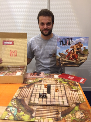 Looking one last time through Eric's Essen SPIEL preview on BGG three weeks ago, Kumo Hogosha, a game with some kind of sumotori caught my eye, just because of the great cover. At the time I looked, I could not find really much information about the game. But I had a good feeling and so I wrote to the French publisher MORNING PLAYERS (that up to now only distributed games) to set-up a demo meeting during SPIEL. No sooner said than done and so I am sitting here with Valentin from the MORNING GROUP for an introduction to Kumo Hogosha. First thing I had to learn was that a Kumo Hogosha is a guardian of the clouds, a skilled man who is selected by the gods to become some kind of demigod. To find the right people for this, the gods have nothing else to do than setting up a tournament, in which strong warriors, called the Kumotori, fight against each other to find the worthy winner. ![]() The game can either be played by two players or by four. I would say that is originally a two player game, for in the case of four players, you play in teams. And in fact Valentin told me that balancing the game for two players was quite easy, but for four players it was much more difficult. But in the end they seemed to be content. ![]() Each player has his own area in form of a small player board where he places his Kumotori. In the game these warriors are six-sided dice, each side showing a different movement symbol. These warriors are sent to the arena, a rotating board of 9x9 square fields, each big enough for one die, that is placed between the player boards. Once placed in the arena, the upper side of a die determines the possible movement of a warrior. It is the aim of each player to push the Stone of Balance (an impressive clay cuboid) outside the arena into an opponent's camp. Of course this Stone of Balance is placed in the middle of the arena at the beginning of the game. That sounds rather unspectacular, but easier said than done. ![]() To push the stone the players have to enter the arena with their Kumotori, reach the stone and fight against their competitor(s), who are trying the same, only that they want to push the Stone in the other direction. Each turn, the active player has five actions. Most important, of course, is the movement. For this I can either move a Kumotori the simple way (move to an adjacent space) or I can use the advanced movements, that are shown on upper side of a die. There are indeed some very nice movements to push the stone and fight your competitors. Certain movements even allow to arrest your opponents, sending them to a prison zone at the edge of the game. These imprisoned warriors can be released again (1 action), but must enter the arena from the edge of the arena. So they loose a lot of speed and must laboriously reach the fighting zone again. Valentin explained that in the core game of Kumo Hogosha each player has the same set of dice, but maybe in the future there will be other clans with different abilities and movements. Of course it is also possible to change the active side of a die, but on the other hand this will lose time, because it costs you another action. This alone could be an interesting game, but what really ransacked my brain was the fact, that you also can rotate the whole arena by 90 degree for one action each. So you see yourself confronted with totally new game situations unless you are able to plan ahead and guess what your competitor(s) will do the next turn. Like Unita by HELVETIA GAMES in the year before, Kumo Hogosha uses the die as a game piece and not for rolling. The upper side gives the active strength of this game piece. It was this element and the idea of the rotating arena that tempts me in. I think that Kumo Hogosha is one of the games that needs to play in series. Like with chess it seems to be necessary to fully understand your availably movements in a given situation. I would think that the game has a steep learning curve, but I also think that it will be best, if you and your competitor(s) are at the same level and perhaps even have reached the top. It is a game without a luck factor, so you it really seems to be necessary to know what you are doing to win the game. Great design of game materials, beginning with the box and ending with the Stone of Balance. After this experience I once again had no time to rest, so let us right go ahead to the next booth: A game I still admire, although the first edition is already over ten years old, is the great War of the Ring. It is now produced by ARES GAMES and still fascinates many players. So I was very excited when I heard that Roberto di Meglio, author and publisher, announced the first expansion for the second edition of War of the Ring. Would it be like the first expansion for the first edition? I must be honest. I have played many games of War of the Ring and I also have the expansion Battles of the Third Age, but I seldom used the expansion. The core game seems to be so complete that, even you put some elements of the expansion to the game, you do not seem to need them. ![]() So I had mixed feelings and I told my minds to Roberto. And he? He approved. So that is why they changed quite a lot in this new expansion. The basic idea of the expansion is to strengthen the individual characters and some of the minor units of War of the Ring, like the southern nations and the Ents. Of course also the Eagles may not be missing. Roberto said that they are now very content and proud and think that these new element will be quite more helpful and frequently used. To be sure of this, they also introduce a new die, that solely can be used for the new units. The new expansion will be released in the next spring, so this Christmas (my favourite time period for playing War of the Ring) I will still be alone with the core game... After this first glimpse of what expects us in the future, I looked for something simple. A word and a blow and Roberto showed me a new, fast and easy pirate card game th