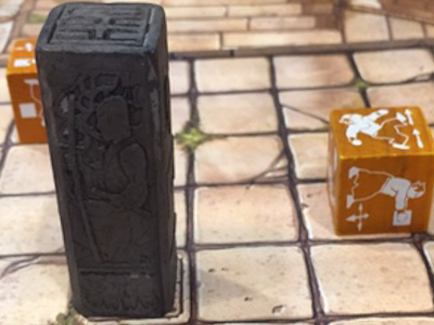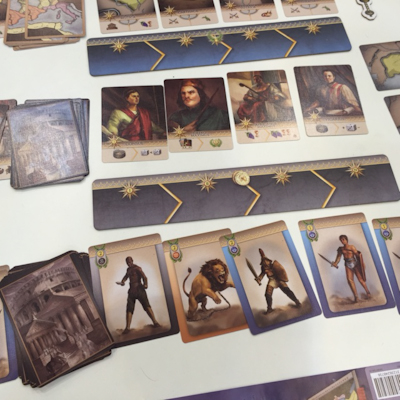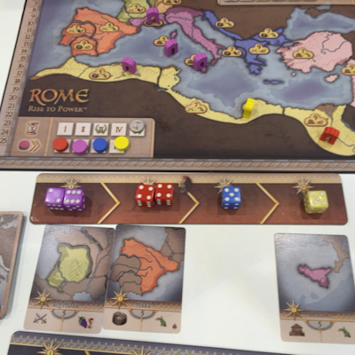 The namegiving dice come into the city as a means for activating the locations. Each player possesses a total of 5 different coloured dice, and each of these colours corresponds to one row of locations on the player's City board. So, during setup every player will roll his hand of dice for the first time, placing each dice on the location which can be identified by the dice's colour and the number rolled. Then the players start taking turns, and during a turn a player activates the functions of the buildings which have received a dice in an order of his choice, generating resources, military power and using some other special functions.