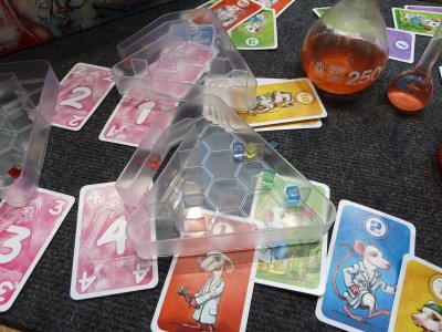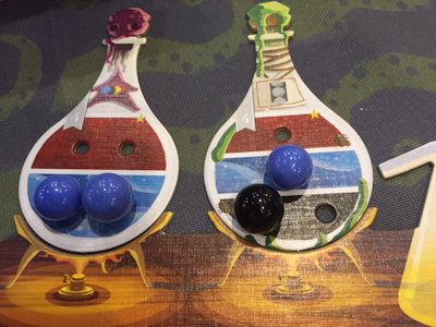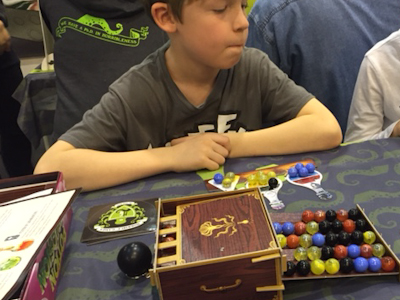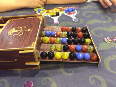 Potion Explosion, a kind of puzzling game, in which players are doing their exams in potion at the Horribilorum Sorcery Academy (any resemblance to Harry Potter's school of witchcraft and wizardry is purely coincidental, I was promised (But why does the headmaster then answers to the name of Albedus Humblescore, one could ask? Well better not ask, I thought and concentrated on the rules)). We still needed some fellow players and as we did not find any volunteers, I called for my wife and my son and together with a friend of my son we completed our gaming group. Equipped with two Bunsen burners (in form of a player board), each burner filled with a starting potion recipe, we began the game. Our potion recipes, lovingly designed in form of a flask, have holes for necessary ingredients that come in form of coloured marbles from a dispenser. It is this dispenser that is the actual reason why Potion Explosion again is something very special. In other words: the dispenser is the heart of the game. ![]() From a tank all marbles put into the dispenser roll down and fill five tracks of a slide. As a result you, in your turn can pick from eight marbles on each of the five tracks. Now the reason why Potion Explosion is a puzzling game is that whenever marbles of the same colour collide after the picking of a marble from a track, it comes to an explosion. The player who started this explosion must take all of the marbles of that colour, too. This of course initiates another roll of marbles down the track which can lead to further explosions again. So by cleverly choosing the first marble you can start a chain reaction that brings you a lot of new ingredients for your potions. ![]() Once completed, potions are taken as victory points to the private area of the player. But that is not all. In later turns they can also be drunk which inducts special abilities which of course is pretty cool. ![]() Playing Potion Explosion was really great. I love puzzling games and especially the dispenser seems to be a really new and funny element in boardgames. Again HORRIBLE GAMES seems to have created a very unique game. I am already looking forward for more potion brewing in the weeks to come. At the moment I think that Potion Explosion could become one of my favourite filler games for my various board game meetings. My family, especially my son, already expects to be included in further play-testing. After this first impressions for today, I had to run myself, too. There were only some minutes before my next appointment, so we better go directly to the next game: Introduction: Kumo Hogosha (Morning Players, Booth 1-F131)