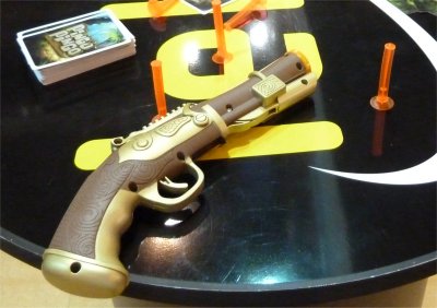 Thinking back about the use of dart guns in boardgames, two titles spring to my mind. One of them is Supergang, a classic mobster game which has been released by LUDODELIRE all way back in 1985. The other game, Cop & Killer was done in 2007 by GAMEHEADS, a small publisher located in Berlin. However, whereas both of these games tried to embed the dart gun shooting into a somewhat strategic gameplay, Pingo Pingo does not even try to make the difficult combination of shooting and tactical gaming. Instead, Pingo Pingo positions itself clearly on the light fun and action side, a decision which greatly enhances the overall playing experience. In addition, the dart gun included in the game is not only fashion made just for Pingo Pingo, but it actually seems to be a high quality toy. I had discussed my good impression on the workmanship with Matthieu from IELLO on thursday, and he had confirmed that the game had been sold in France since summer and only two guns had been returned to them with a defect.