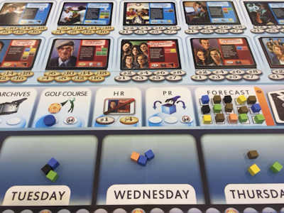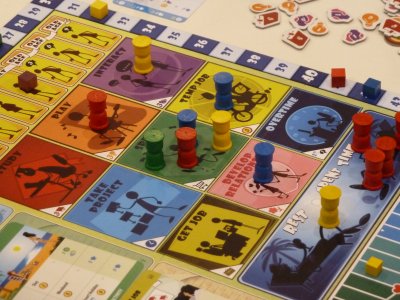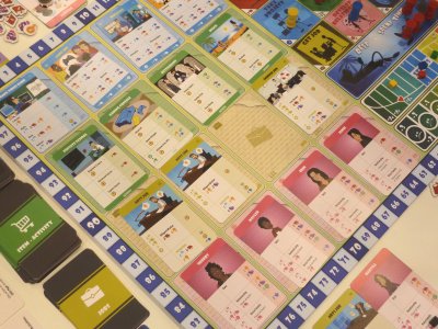 During each round, the players can spend their Hourglasses for a range of possible actions, with some actions like getting a job being unavailable during Adolescence and the taking of overtime being banned once the game reaches Old Age. Some of the available actions simply are focused on gaining some resources (studying, playing, interacting), whereas others allow the players to gain a card from one of the categories available on the gameboard. During their "lives", the players can get a job, take on projects, spend money for items and activities and develop a relationship, and for all these alternatives a quite wide range of cards is available on the gameboard, with the display being renewed at the beginning of each round.