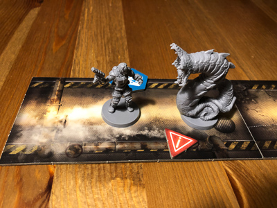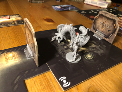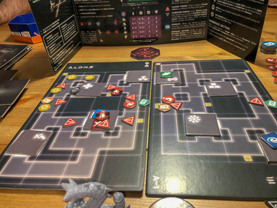 ![]() Having said this, you can easily conduct that Alone is a highly unsymmetrical game, indeed it is probably the most unsymmetrical game I own (ignoring the game master roles in RPG). Adopting the idea of the video games, the hero player starts at an arriving point of a two storey rectangular dungeon, divided into 24 sectors with floors and four rooms on each level. The storeys are connected by two stairways at the middle of the two longer sides of the storeys. The rooms have 2-3 doors respectively that lead to new floors again. All of that is known from start on. There is only one problem: The storeys and rooms are all set up by the evil players behind a screen and the hero players does know nothing about where to find which room and where is is at the beginning of the game. On the contrary, the hero is placed in just one sector of the labyrinth by the evil players and the only thing the hero player gets, is an enlarged version of this sector with his hero figure. She or he neither knows the orientation of this sector or any of the sectors adjacent to it. To make it even worse, it is completely dark in the dungeon. This on the one hand worsens the visibility of the hero, on the other hand the evil creatures become more powerful in the dark, while the hero is handicapped in the fighs. Alone is a round and turn based game with the hero and evil players taking turns alternating. Let's start with the hero player to see what he can do in his turn: obviously there is a move action, for the player has to find his or her objectives. Normally in a scenario the hero player has to find 2-3 specified rooms to do some special actions in it, before he gets defeated. And of course the hero has to move to find this rooms. But moving to unrevealed sectors is not always the best choice. Admittedly, you don't fall from the edge of the world when you do it, because the evil players have to add the new sector as given on their hidden labyrinth, but with the room, they also place all elements that are currently in the room. If there is a creature in the room, it might scare the hero with the result of loss of self control, next to health a critical value for the hero. ![]() To prevent moving to unrevealed sectors, the hero can use an explore action that reveals the next 2 adjacent sectors in a chosen direction. Again the evil players are forced to add the corresponding enlarged sectors with all elements in it as given from the labyrinth. But, because the hero is not directly in the same sector of new creatures, he won't get hurt. So, that's usually a good choice before moving, but on the other hand it takes time, and time is a critical factor as you will learn. There is just not enough time to explore everything in the labyrinth, and therefore it is good that the hero player can also use a locate action. With this action the evil players are forced to tell the hero player the distance from the hero player's position to two chosen targets on the map. For example the hero player could ask for a certain creature he has faced before and the final room he is looking for. The hero player can also scavenge to find items in the sector he or she is standing. Items can be very powerful for the fights and to amplify the one or other action, but again it takes time to find them. Speaking about fights, there is the next action. Of course, the hero player can fight the creatures he finds in the labyrinth. A simple dice roll (normally with 2 dice) determines if the hero hits the creature. Then, the creature stats table tells us, if it takes a wound and when it is dead. Creatures do not immediately strike back, but a hero can usually only perform one action in his or her turn. The only exceptional is when the hero player chooses to take a bullet time, enabling him to perform two actions in a row before the evil creatures can attack. But of course, you will guess it, bullet times are limited by adrenaline tokens, that on the other hand can be used for healing the player (and might be missed for that)... Last but not least, the hero player can interact with elements of the board. On the one hand these elements are found in the rooms to reach the objectives, on the other hand there are some LCU's (Light Control Units) that can switch on the light in adjacent sectors in one direction from the hero. As said, lighted sectors enormously improve the hero player's abilities, but again: time is precious.... ![]() Let's now see how the evil players can react. Comparing to the actions of the hero player, the evil players' actions are quite simple. In reaction to an action of the hero they simply can play one of their hand cards. With these cards the players can spawn new evil creatures, move the existing ones and do some major or minor direct harm to the hero. Most cards have additional effects that make creatures stronger or bend the rules. Of course, most of these actions are carried out on the labyrinth behind the screen, hidden from the hero player. Now you might think, that this is a boring job, compared to the actions of the hero. But it is definitely not. The evil players have to think out a good strategy to position the creatures at the right sectors, mislead the hero, forcing him to take an uneven course towards his or her objectives. Furthermore, the evil players always have to keep the labyrinth as well as the enlarged part the hero is facing up-to date. Creatures however automatically attack (again with the help of a dice roll) whenever they are in the hero's sector at the end of a turn, and whenever the hero leaves a sector with an evil creature. Moreover, creatures turn off the light again, when they are in an enlightened sector without the hero. Three or more rounds with eight turns each can be played before the nightmare mode is triggered. This is not the end of the game, but it makes it significantly more complicated for the hero player to win the game, because all creatures become stronger in nightmare mode. As sai