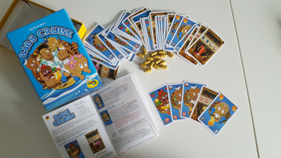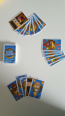 ![]() At the set-up, the deck of baby cards is placed face down on the table, each player draws a card, then the oldest one starts. On their turn the players draw a new card, show this card to all other players and passes it to another player again. After each round, the players check if one of them has won. If there is no winner, the player who received the card is the next player in turn. So there is no fixed order, because players can freely choose the recipient of the card. On the baby cards you can find cocktails, fruits, poker chips and of course the babies, on most cards several of these symbols. It is the aim of every player to collect three matching fruits, because this wins the game. But of course this is not too easy, because you only get new cards from the other players. So you need luck and a lot of bluffing to get the right cards. The babies have different characteristics: . ![]() When a player receives the lucky baby, he also gets poker chips that you can use for the jackpot, the captain baby forces a player to give one of his hand cards to another player and the shy baby is automatically passed on to the player with the fewest cards. If you have collected cards with symbols of three of the same cocktails, you get seasick, as we all are on a boat (that`s why the game is called Baby Cruise. Of course, you are handicapped after that, but you may keep it secret unless the police baby finds out. So getting drunk is not too bad immediately. But if someone else gives you the police baby, you must show all your cards and if at that moment you still have the three equal cocktails, you are arrested and the player who passed the card to you wins the round. So you see, it is very important to remember who got which card in the rounds before. While the police baby can be dangerous for a player, a jackpot is something positive. Receiving this card, gives you an additional chance to win the game, if you have the right combination of fruits and poker chips already. If more than one round is played, golden milk bottles are used to keep track on the victory points. The winner of a round will receive one or more bottles depending on the cards in his hand. When all bottles are gone, the player with the most milk bottles wins. ![]() Up to now, we only had the chance to play Baby Cruise several times with three people, giving us a good overview of the cards. Although it played well, I think the game will certainly be more interesting when more players are participating. Compared to Baby Blues the baby theme was implemented slighly weaker, but still it felt very nice and makes you want to have more (perhaps Baby Blues, if you don't have it yet). And if, after that, you have an insatiable demand on baby games, you might be lucky, because I heard that JUMPING TURTLE GAMES wants to publish one baby game per year... Anyhow, Baby Blues is quickly explained and is well suited for an unusual filler. To sum up, I think that Baby Cruise is a funny card game for three to six players and defenetly not only for expectant parents. | ||