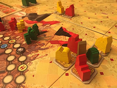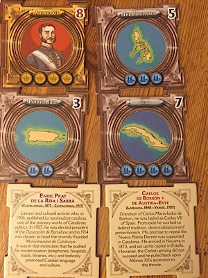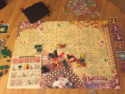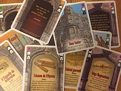 ![]() But unfortunately history tells us also that growing is often combined with unhappy and disappointed people. This is the other part of the game. So in our third phase of the individual turns, we are forced to place striking workers, depending on the current immigration rate and the status of the building, in Raval in the centre of Barcelona, but also one of the poorest neighbourhoods. Each player has his or her own strikers. Five are allowed in Raval and can more or less be controlled, but as soon this number is exceeded, new strikers must be placed in the barricades where they organise the rebellion. Basically you can say: you can score more prestige by building better-up buildings, but on the other hand people will get unhappier, and, as a result, you have to place more striking workers too. The rebellion is the first thing we have to carry out at the end of each phase. All striking workers that are still in Raval are put in a bag. Soldiers in form of black wooden counters are added, depending on the number of players and the number of strikers in the barricades. Then it is time for the rebellion: randomly, as many counters as the current immigration rate are taken from the bag and as a result, every player looses as many prestige as the number of his own striking workers. After that, new cards are dealt to the players and some more scoring takes place after each phase and after a period ends. Two phases are played in the first two periods, the last period lasts only one phase. ![]() Let us have a closer look at the action cards: we already have learnt about the city cards that are necessary to construct new buildings. Popularity cards can be played as normal city cards too, but they also have a special ability or can be played as an event. This sometimes can change a lot of the game, so it is important to find the right moment to play a card, especially because some abilities are triggered by the current position of the player on the prestige track. Influence can be gained by this way too. And it is especially this influence that can player boost to the top in the end game. You can use this influence to acquire influence cards for the final scoring at the end of the game. Remember that a lot of popularity cards can either played as city tiles or as event cards, for example to get influence. So you have to decide between building up the city in the early stage or gaining more influence and use it later in the game. ![]() On the other hand, all players have influence on how the social unrest evolves by playing more or less events. With each rebellion and every upper class building built the counter of the social conflict track moves further. By this, disasters or smaller wars can be activated with the effect that part of the available influence cards are removed from the game. In the end, this can also end in a total anarchy, changing the scoring mechanic for the rest of the game. This, of course, can also be a strategy to win the game, because in an anarchy budget houses are much more worth than before. ![]() So players in Barcelona – The Rose of Fire can follow different strategies. Either you try to build more and more buildings, risking rebellions and pushing the social conflict. In this way, more and more influence cards become unavailable. On the other hand, you can play the game smoother, hoping to get those influence cards and to win in the end game. What is best to win the game not only depends on you (and your lucky hand while drawing cards), it is mainly dependent on your opponents moves. That's why I think the game is best with the maximum number of players (4), all of them knowing the game. Barcelona – The Rose of Fire looks very nice, all components are of good quality. Additionally, the game comes with a lot of explanation about the historical background. Each influence card and most action cards have an informative text part. It takes some time to find into the game, a lot of new players only concentrate on the building part fist. But that is not what the game is meant for. So you should try to get your fellow players excited long enough, so they can see what's behind all the influence and the more complex social conflicts. | ||