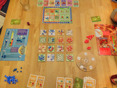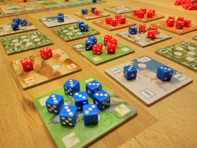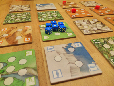 ![]() The biosphere is represented by a certain number of different environmental tiles. The dimension and structure of it depends on the number of joining players. The different territories are marked with white circles that show how many populations may be placed onto an environment. Regions with good living conditions have more population spaces than uninhabitable ones. Additionally, the environments have a direct effect on the lifespan of a population placed on it. The starting lifespan in forbidding territories is lower than in welcoming terrain, which prevents the species to be really successful in expanding and surviving. But this is only one aspect the players have to think about. Attributes like the reproduction ability, movement possibilities and the evolution scale influence the game play. Sometimes it is better to have a small and versatile population; sometimes it can be more productive to control a large and very specific species. Players have to improve and alter these attributes through the gameplay in order to reach the goals. Fortunately, players can keep track of the developments on a big player display, which contains all necessary scales. Although there are 300 dice in the game box, players never roll a single one of them. So there must be another option to develop the evolutional skills of player’s species. Instead of the effect of a die roll evolutionary points are the game´s currency. Each round, players gain evolutionary points in a special game phase. Players can use these point to move along the evolution scale, the tie breaker band and - also very important - to buy development cards. On the one hand players are able to buy any card available on the display he can afford. But on the other hand they only are allowed to play one card per round when the two values shown on the card are exactly the same as the markers on the evolutionary scale. Whenever a player plays a development card, he receives the bonus depicted on the card, which allows him to increase the value in the corresponding scale on the player's display. One result, for example, is to enlarge the lifespan in the polar region by one. But watch out! The movement costs on the evolution scale are rising with every extra step and they increase exponentially per number of spaces moved. Only a wise and anticipatory combination of buying cards and clever adjust of the evolution scale gives a player the possibility to improve skills like fertility, lifespan, movement or even gaining evolutionary points. A lot of altiloquence about populations and species, but no idea about how players can bring the dice into the game. Easy enough! The first three population dice are placed by the players in their very first turn. Afterwards it gets a little more complicated, because the populations can only expand by movement, reproduction and filling up the environments. In the first rounds ,movement isn’t too productive, because there are not so much populations to move and, additionally, movement expends energy for changing the living conditions. As a result, the players have to reduce the lifespan of the population moved by one. ![]() New populations are born into the biosphere by reproduction. The number of new populations a player may place during the game depends on the value of his reproduction scale. The populations may be placed on an empty space in an environment tile where the player has already populations of his own or in spaces that are horizontally or vertically adjacent. Another way to get new populations is given by filling up during the environments phase. Whenever a player holds the majority of the spaces on the tile, he may fill up the empty spaces with populations of his storage. This requires a little foresightedness since all players try to get an easy and perhaps also enormous accumulation of new population. Remember, if a player has one population in a five space environment tile, he may gather up to four new dice to place them into the game. Once all new populations have been placed, the dice are turned to their correct number, depending on the lifespan of the population in the corresponding environment and the wheel of life. This wheel of life is turned in the beginning of every round by one step, which causes one of the five die numbers to be marked by the illustration of an elephant´s graveyard and the populations with that number become extinct in this turn and their dice are taken off the map. This gives all players an overview of the rounds the populations will survive without turning every die at the beginning of each round. As I mentioned before, no one wins the game only by only surviving. Players have to fulfil five of seven face-up assignments in order to be the winner of Biosphere. These missions come from different categories. Some of the goals are reachable by controlling tiles or patterns of tiles, others require developments on the players' displays or specific numbers of populations on the game board. Every time I played the game up to now, I have thought: “Good God! How can I reach just one of the goals?” However, while playing the game and after accomplishing the first assignments, the speed of reaching goals accelerates. Due to the fact that every player places a marker onto the assignment card he has already fulfilled, the game becomes more thrilling the longer it takes, because every player has to keep an eye on the missions an opponent might reach in the next moment, in order to be able to destroy their plans if possible. ![]() Concerning that Biosphere is the designers’ first work, the game is very straightforward and looks fantastic. However, the game is rather complex with a lot of interaction between the players. After studying the rulebook for the first time, I wasn't sure how the game would be like. But after only a few rounds, it turned out to be very smooth, because you get used to the mechanics of the game pretty fast. Very helpful are the great players