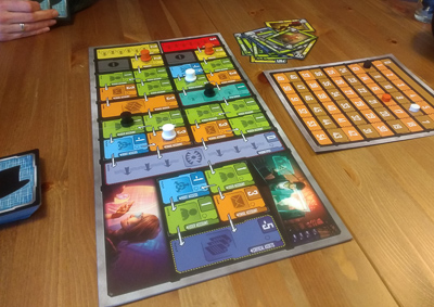 Based on this description you might assume that simply winning a lot of tricks to empty your hand and advancing on the board may be the road to victory, but things are a little more complicated than that: For the most part, thegame board basically consists of two separate tracks and every player has one pawn on each track. The tracks do not join each other until after the large square that covers the height of the board and is labeled Honeypot. The upper track also contains an "FBI server" square. Whichever player pawn reaches one of these squares first, gets stuck there and can no longer move. Combined with the fact that player pawns cannot share any squares except the starting squares, but instead move by jumping over occupied squares, players are faced with the conundrum that it is not in their interest to race ahead because they will only get caught in one of these squares and pave the way for their competitors. It almost goes without saying that some of the squares leading to the FBI server and the honeypot happen to have a negative point value which means its occupant is in danger of being forced closer towards or even on the "sticky" square by another player who wins a trick.