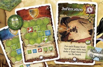 Standing true to their promise to slowly but steadily enrich the playing concept of Battlelore, Richard Borg and the design crew of DAYS OF WONDER now have released Call to Arms, the first set in a row of Battlelore expansion packs. Containing no new figures but solely cards, two new types of landscape tiles and several markers, this expansion mainly focuses on extending the rules of the game by adding a new element to the traditional Command & Colours playing system. Thus, the players now will not prepare for battle simply by choosing a scenario and placing everything onto the gameboard following the scenario instructions, but instead they now have a possibility to include the deployment of their armies into the game. ![]() For this reason, the expansion contains six sets of seven deployment cards (3 sets - 21 cards - for each player). Each of these cards shows a small portion of the gameboard (4 rows with 3 to 4 hex spaces), and some of these spaces show the symbols of military units. After the landscape has been set up on the gameboard following the scenario instructions, the players now have the possibility to chose one of their three sets of deployment cards. These cards will be shuffled separately for each player, and then each player draws a total of four cards from his own set of deployment cards. Examining the cards he has drawn, the player now has to assign one of these cards to each section of the battlefield (left flank, center, right flank), whereas the fourth card is kept as reserves. Alternately, the players now will reveal the cards they have chosen for each of their sections, and they will deploy units of the type and on the positions shown on the cards. Finally, each player also reveals his reserves, and he may chose two units shown on the reserves card which he may deploy in addition to the units he has already placed. These two reserve units come into play in sections of the player's choice, but to symbolize their late arrival on the Battlefield (they are RESERVES) they must take positions at the player's base line. Once all units are placed, the game progresses as normal with each player choosing his War Council and starting the battle. However, the rules for the new deployment phase do not stop with this short, introductory deployment mechanism, but instead the players do have some more options which allow them an even more intricate assembly of their troops. Thus, there is an advanced set of rules included which allows players to choose two sets of deployment cards at the beginning of the game. These cards will be shuffled, and each player again draws four cards from his deck of deployment cards to assign his troops to the sections of the battlefield and the reserves. Although this mechanism may sound like there is a higher amount of luck included due to the fact that the deployment cards are drawn from a deck of 14 cards instead of 7 cards, the players now have more options how to organise their army and to add more variation. This is because each deck of 7 deployment cards usually can be played with just the figures of the basic game, whereas a combination of decks may lead to a stronger army for which extra figures are needed. However, due to the fact that such figures have not yet been released, there exist special army chips which allow players to follow the advanced rules even if they only possess one basic game. Also, the so-called Specialist cards are part of the advanced rules as well. Thus, a deck of 10 Specialist cards is included, and from this deck each player chooses two cards after they have assembled their War Council. Overall, each of these Specialist cards somehow changes either the positioning of the troops on the gameboard, the weaponry of the troops or may even offer additional protection by allowing the player to add special landscape features. So, for example, there exists a card which equips all human bowmen of the player with Longbows (long range weapons!), a card for recruiting more troops, a card for moving troops before the battle begins, cards for getting Dwarfs or Goblins as allies etc. It is also noteworthy that some of these cards only may be chosen if the player has a corresponding Personality in his War Council, so that the choice of the War Council also restricts a player's choice of Specialist cards. Once these cards have been chosen and acted upon, the battle starts as normal... Although the new rules for troop assembly certainly include another element of luck in the game, I found it rather enjoyable to have some degree of control where I could place my troops. Due to the fact that both players choose their deployment cards at the same time, unusual constellations are possible on the gameboard which offer the players more room for tactics. The Specialist cards add even more flair, since they offer some last minute adjustments of a player's positioning, and taken together these new rules introduce a good degree of flexibility to the game without actually resorting to a cumbersome points-based mechanism for army build-up which is popular with many miniature wargames. Thus, the real strength of the Call to Arms expansion is the fact that the game remains easily accessible while at the same time including an additional tactical element corresponding to medieval battle formations. To sum it up, I got the impression that these new rules fit well into the game and certainly are a step into the right direction for developing the game further without overloading the rules with unnecessary details. I am hopeful that - if more such expansions will be coming - they will fit into the game just as easily as Call to Arms... | ||