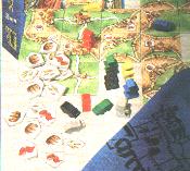 Some new ideas and variations were brought into Carcassonne through the release of the new expansion set Händler & Baumeister (=Merchants and Builders) in spring 2003. This set features 24 new landscape-tiles, 2 new vasals for each player (Architect and Pig) and 20 goods-markers representing 3 different trading commodities (grain, wine, clothes). The goods-markers may be collected by use of the new landscape-tiles included in this expansion. Some of these new tiles now show goods-symbols in the cities, and whenever a player completes a city by adding the last missing tile he will be considered as being the Main Trader of the city, allowing him to collect one goods-marker for each goods-symbol included in this city. When the game is over the players will be allowed to turn their goods-markers into additional victory points. Each of the three commodities now will be evaluated separately, and the player who has collected most goods-markers of a commodity will receive 10 additional victory points. If there is a draw, all drawing players will receive 10 victory points. The Architect and the Pig can be placed like normal vasals. The Pig is placed onto farmlands and once placed it stays until the end of the game. If the player who has placed the pig also possesses most vasals (Farmers) on that stretch of Farmland at the end of the game, the Pig will increase the value of adjacent cities. Thus, the player now will get 4 victory points for each completed neighbouring city instead of the usual 3 victory points. However, if the player should not have the majority of Farmers there, the Pig is wasted. The Architect on the other hand can be placed either on a Road or a City, and by placing him there the player will be allowed to take a double-turn. Thus, if a player adds a tile which continues a Road or City on which he has an Architect, he will directly be allowed to draw and play one additional tile. Once the Road or City is completed the player gets back his Architect and can use him again somewhere else. The new tiles and rules definately increase the depth of the gameplay, and furthermore I would say that at least the Architect has some major impact on the players' strategy. The game now gets faster, and making clever use of the Architect as often as possible becomes a very important factor, because otherwise a player may quickly get into a large lead. However, Carcassonne-Fans should like the expansion because it adds variation to the game. | ||