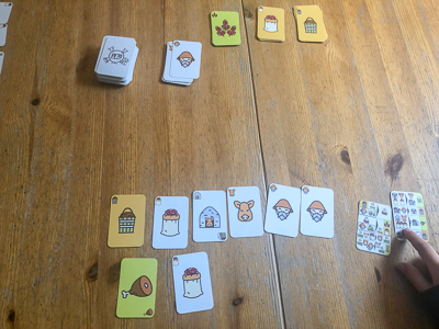 ![]() But what is the game about? Farmer Olaf is a simple little farming game. Each turn a player draws a new card, adds it to the personal supply and checks if she or he has a combination to start a farming action. 16 different actions are possible, from sowing the field until cleaning a boar pen. This is quite confusing for new players, but after a while you will recognize that the actions are quite logical. And the small reference cards help you finding available actions. So, for example you need a boar and a boar pen to feed the boar with three food cards. This will end up in loosing the boar and the food, but receiving a ham and a dirty boar pen. What is dirty, mustn't remain dirty. That's why you can use a worker in your next turn to clean the boar pen, ending with a clean boar pen again and manure. Then the manure, together with a tractor or two workers, can again be used for sowing a harvested field with the result that the field is sown again and can be harvested in a later turn. You see that there is a permanent giving and receiving in the game, and often you will need more cards to play an action. That's the time for trading with your fellow players. You are free to do so, you only have to find a player who is interested in your offer. ![]() Of course, all the farming is not the end in itself. It's the players' aim to collect as many green cards as possible. Those green cards are the final products from a farming action like the ham from the example or milk, wool and quinoa. The game ends in the round when the last card from the draw pile has been taken. Farmer Olaf is not a complex game. Much depends on the cards you draw and from the willingness to trade of your fellow players. Especially at the beginning of a game, there will be the one or other round in which you are doing nothing but drawing a new card. If a player is unfamiliar with the game, this will end up in a lot of downtime, because she or he will look after possible actions in the reference cards, whenever she or he will get a new card. But the learning curve is deep, because -as said- the requirements for the actions are quite logical. ![]() So the game speed will increase rapidely and then the game develops into a nice micro game for now and then. Don't expect a deep strategy game, the game is more a children game and can be easily learnt by five-year-olds and older. And for the one or other city child, the farming actions might be even educational. Together with the nice idea of the portable gamebox, Farmer Olaf is definetely worth to take on to the next journey. | ||