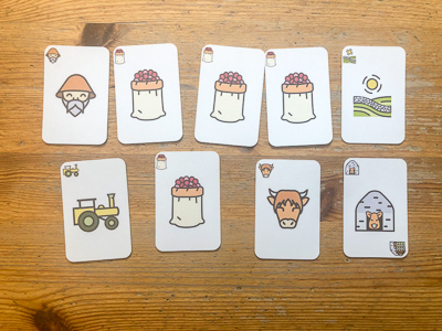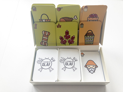 I discovered Farmer Olaf at the news show at SPIEL 2018. Marcin Pietkiewicz, the author of the game, walked around the hall, the small micro card game Farmer Olaf attached to his belt. The gamebox seemed to be open and indeed: Marcin was always ready to play the game. All necessary cards were arranged in shelves inside the open box including the draw and the discard pile. Only the hand cards had to be hold in the hand. Well, that's probably why they are called hand cards...I eyed the game up for a while until Marcin noticed my interest and we went over to his presenting table.