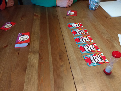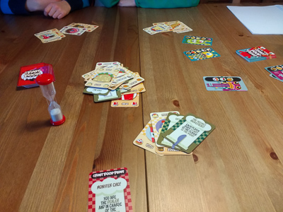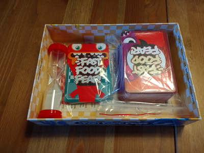 ![]() The game ends when all monsters have eaten, resulting in a win for the entire team, or when the sand timer runs out and there are still monsters left to feed, in which case the entire team has lost the game. Now, if you suspect that it is impossible to achieve the goal of the game in a mere two minutes, you are of course absolutely right. The deck contains several event cards that allows the active player to turn over the sand timer, which, if done at the right time, will allow the team more time to cook up all those meals. Most other types of event cards allow the players to exchange cards in one of several possible ways, another type of card allows a chosen player to discard up to three cards and finally there is one type of event that allows discarding one of the customers and replacing it with a randomly drawn new one. If all of this still sounds too easy, fret not: Not all courses appear in the deck with the same frequency, so just discarding every card that is not needed at the moment is rarely a sound strategy. On top of that, if the players burn through the draw deck, it will be turned over (in the exact same order it was in) but another customer will be drawn and added to the queue. As one might expect, gameplay is frantic, frequently bordering on absolute chaos. Players must carefully manage the card hands in their team so that different players build up the menu for the different monsters that are currently on the table. The communication required to decide on who feeds which customer cuts into the time budget and at the same time options for passing ingredients around are limited and require careful coordination. While there are event cards that allow specific players to exchange cards, the most frequent event only allows players to each pass one card around counter-clockwise (while the game progresses in clockwise order). It is vital to make sure that the game progresses in a way that makes optimal use of the cards that allow turning the sand timer over. ![]() I recommend to play this game with a group of people that know (and like!) each other very well and are of a forgiving nature. The second option is to play it with a bunch of people that do not mind never talking to each other again. In the heat of the battle, mistakes will happen, and in the spur of the moment, people will react much less magnanimously than would be appropriate in light of the fact that this is just a game. The single most comic and frustrating experience was, when a "pass a card to the right" was played with a few seconds left on the clock and the player who was up next passed his only "turn the timer over" card to the right, condemning the team to a shattering defeat. The artwork is appealing, with simple, bold shapes and colors, but while the monsters are clearly discernible as such, all the food looks like it could equally be served to human customers and only the short description in the instructions tells you that e.g. the fries are prepared in motor oil and the sandwich is of the "eel and seaweed"" variety. While this does not take away from the game mechanic, it does feel like a missed opportunity for establishing the setting of the game. While the rules are deceptively simple, this is a game that takes a while to master. As time is of the essence, there is almost no chance to make decisions as a group. Instead, one player has to call most of the shots with all of the other players just supporting him (in fact, the game instructions recommend that the player who is currently the dealer should do just that), which takes away much of the enjoyment, even if that role is switched between rounds. Staying in the land of free-for-all chaos comes at the price of standing a much slimmer chance of actually winning a round, which is also frustrating. All in all, Fast Food Fear is a game that I can not wholeheartedly recommend, because personally I did not enjoy it that much. I hope I was able to give an unbiased impression of what it plays like and ultimately it is up to you as a reader to decide whether or not this might be your cup of tea. I can also imagine this making a decent team-building exercise, at least if there is a moderator present that makes sure things do not get out of hand. At 15 minutes playing time and with virtually no time required for setup, this is a game that can be played at almost every opportunity, e.g. at beginning of an evening when you are still waiting for people to show up. For people who really get into Fast Food Fear it is probably very easy to kill an entire evening honing their strategy and team communication. | ||