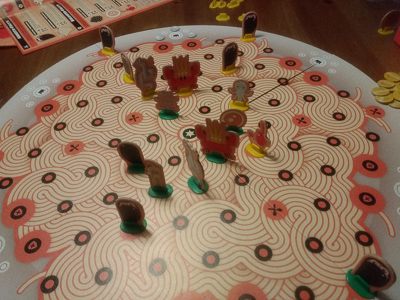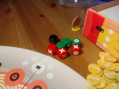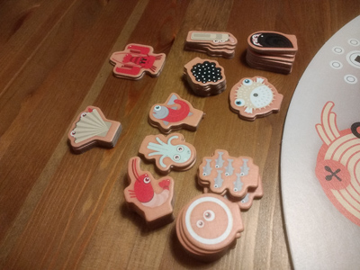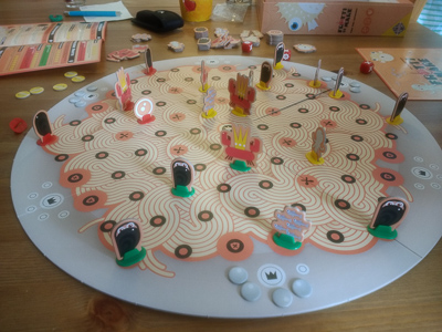 ![]() Independent of the current phase, each king crab is allowed to give an “inspirational speech” at any point during its player’s turn. Giving an inspirational speech allows the king crab a specific action. Performing an action will affect the amount of pearls in the royal treasury which doubles as the king crab’s life gauge: Lose your last pearl and you are out of the game. One type of speech allows you to move your crab to an adjacent spot on the game board and will gain you an additional pearl while the other speeches will cost you pearls. The effect of these other speeches are benefits like an additional action phase for one of your Frutti and, as one would expect, the greater the benefit provided by a speech, the more pearls you will have to invest, crowned by “sleep with the fishes”, which allows the player to immediately remove an opposing Frutti (which obviously can not be another king crab) from the game board for the hefty cost of four pearls. Combat is resolved using dice: The attacking Frutti rolls a number of attack dice determined by its type, the defender rolls a number of defense dice, and if the attacker achieves more successes than the defender, the defender is removed from play. King crabs lose one pearl from their treasury for each hit scored against them and do not roll defense dice, but roll a special die for a one-in-six chance of avoiding an attack altogether. In addition, most Frutti have a special ability that modifies their attack or defense in a certain way. Barring some minor details the preceding paragraphs pretty much sum up the entirety of the game’s rules. This, combined with the simplicity of the board and manageable amount of units, makes for a quick start into the game. After the first two or three turns that mostly see players getting a mighty mussle into place and recruiting a unit or two, the action generally starts to heat up pretty quickly. Unless you manage to completely fly under the radar and and have the other players battle each other, the game will have you on your toes most of the time because the next threat is typically within movement distance from one of your units and if you heed my suggestion and play this with at least three players, you will never quite know where to look. ![]() Gameplay progresses quickly and even if you play this game with a group of hopeless over-thinkers like myself you are likely to finish it within the projected 30 minutes of playing time. While the rules are deceptively simple, there are quite a few nice details that ensure a well-balanced game that has little chance of dragging itself out. First of all, it is not allowed to recruit more than one of each type of Frutti in each round, which keeps players from biding their time hoarding money and then rushing the board with a host of cheap units. The worker Frutti are regular units (and weak ones at that), which can be attacked and killed by your opponents. And finally, only one of the very powerful royal Frutti can be recruited into any single army. The choice of (royal) Frutti allow different playing styles ranging from hit-and-run attacks using fast units to slow, methodical approaches. There are units like the “creamy caviar” that have no attack or defense capabilities of their own but can be removed from play to recruit another Frutti in their stead (at regular cost). Opponents will be faced with the decision to pursue these units and have their forces tied up in the pursuit, or risk a more dangerous unit being recruited in a location that may threaten their king crab for them. Another interesting aspect is that of the king crab. While sitting on its throne it is untouchable, effectively making its player immune to elimination from the game, but at the same time leaving the crab on the throne bars one of the three possible routes to win the game, and the most direct one at that. Even when chosing a strategy involving one of the two other ways to win, players are unlikely to be able to completely forego the benefits offered by the king crab’s inspirational speeches. However, in order to obtain the pearls needed to hold any of the speeches that actually affect the game flow, the king crab needs to move, leaving the safety of the throne behind, leaving it open to attack for at least one round after leaving the throne. If, on the other hand, a player tries to make a beeline to the center they will find that they can only move four spots before the royal treasury is at capacity, effectively barring further movement of the king crab until the player has found a way to shed pearls (i.e.&xnbsp;hold at least one different type of inspirational speech). Only after spending spending two pearls they can reach the center of the plate, which is six moves away from the throne. At the same time, the king crab is quite vulnerable and opposing players will nibble away at those pearls (which, remember, double as the king crab’s life points), making it very likely that your king crab is picked off before it ever reaches the center. ![]() Likewise, holding the center for one round with a royal Frutti is no easy feat. First of all, you have to consider that no spot on the board (save for the thrones) is more than five moves away from the center spot and that some Frutti can move as far as three spots and the maximum attack range of some Frutti is also three spots. Secondly, all other players know that they’ll lose the game if they don’t manage to kick you out of the center. This means they will most likely set aside any fighting for the moment and strive to kill your Frutti. All it takes is one hit, and your Frutti (along with the considerable amount of coins you had to spend on it) will be sunk. The visuals are cartoony and simple, they provide good recognizability of the different units and keep the tone light. As remarked intially the manual is named “Recipe” and each player has a quick reference “Menu”, which adds a nice touch, but the d