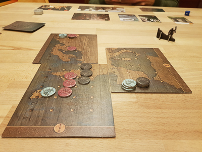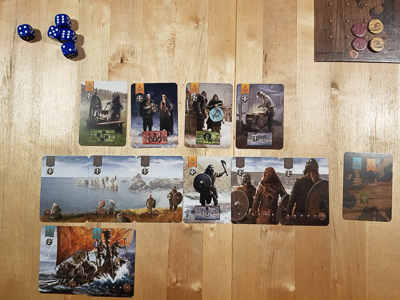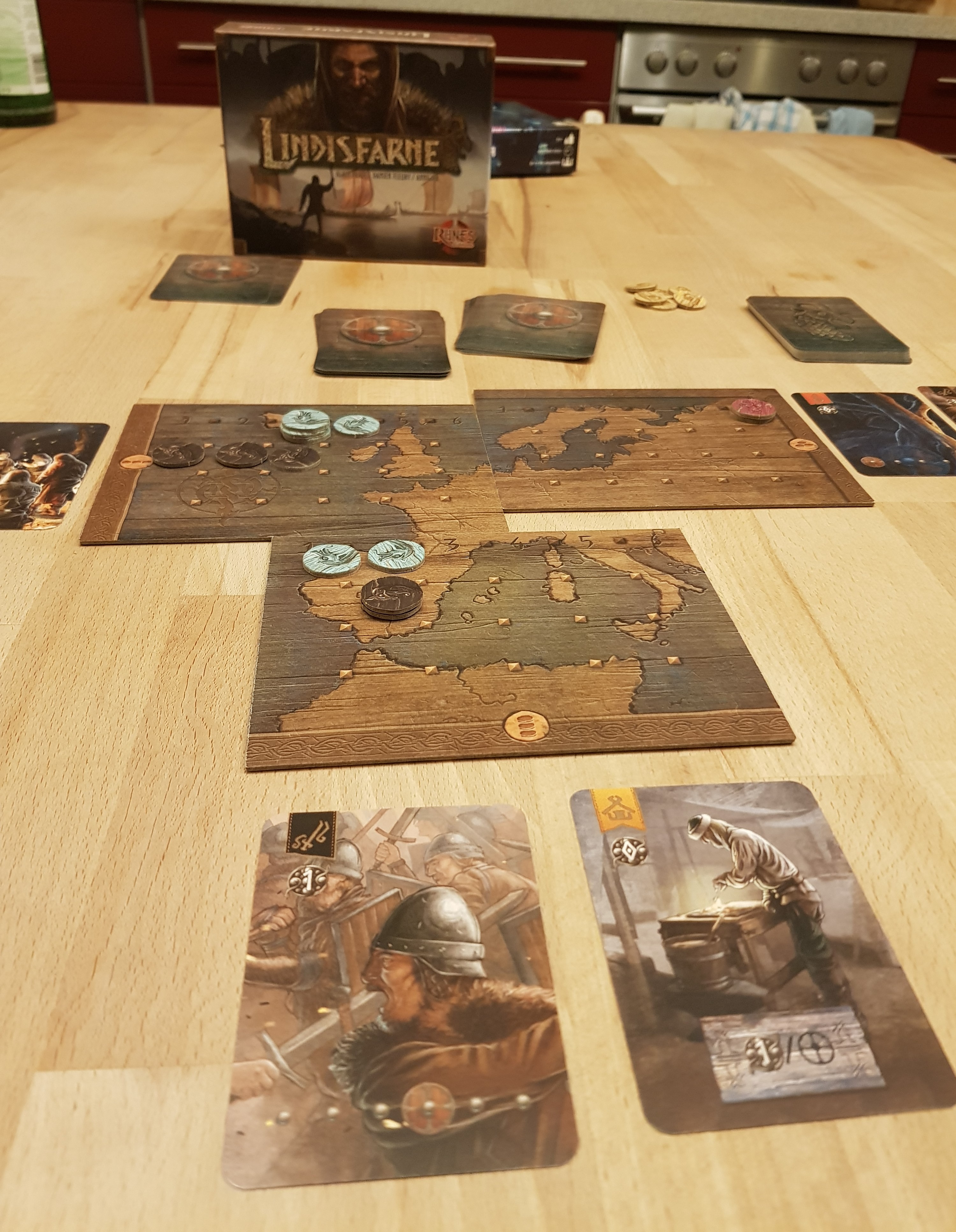 ![]() Yes, in the game Lindisfarne players control the fate of a Viking clan. As raiders of the sea they try to bring the most prestige to their clans by attacking the countries of western Europe. The game comprises 6 of these expeditions, each one with several rounds, and two actions for every player per round. The gameboard is composed of three parts and represents a nautical map. So, prepare to depart and return to the village. A player who wants to depart must roll as many dice as he has Viking tokens, and chooses at least one die for one of the three boards by placing a Viking token on this board below the corresponding die value. If he is the first player to do so, he places his token on the open line that is the furthest north. If he is already present on the board, new tokens are added to the same line, and if a die value is already occupied, the new token is stacked up the previous one. When the first player has finished, the next player rolls the dice, and so on. ![]() All players only get 6 Viking tokens at the beginning of the game, so the more tokens a players uses in one round, the fewer dice he can roll in his next turn. Adding the tokens is a struggle for supremacy on all three boards. The scoring of the boards takes place, when all players have returned to the village (which ends the expedition). There are two returning options. Either a player decides to return at his or her own request, gaining him or her one rune token (these tokens may modify a die result by +/-1) for every Viking token he has left this round (the first player to do so will be the new fist player for the next round), or a player is forced to return, because he has no Viking tokens left. The leading player is determined for every single board. On the first board the player with the highest total becomes the leader, on the second board the player with the longest suit in the same line and on the third board the one with the highest stack of tokens. Players will harvest the fruits of their labour at the end of an expedition by choosing one of the corresponding two destination cards from the board or by drawing two objective cards, picking one instead. These cards bring the prestige to the clans. Some cards also support the Vikings, immediately or at certain situations. Other cards have special effects at the end of the game. There are also cards that score prestige points by creating a fresco or fulfilling an objective. The game ends after the 6th expedition with the player with most prestige points wining the game. ![]() I liked playing Lindisfarne a lot. First, the game caught my attention just because of the great artwork. But later I realised that this game is also an awesome mixture of a dice rolling and set collection game. Now that I have played Lindisfarne in a wide variety of constellations, I can say that my first impression has been fully confirmed. In the first rounds you can't estimate exactly how and to what extent you should place your dice, but after a short time you develop a strategy, which you have to adjust again and again due to the tactics of your opponents. In the course of the game a player learns the value of the cards, which can be seized by his robberies. However, I must say that the two-player variant of Lindisfarne cannot compete with a three- or four-player game. This is mainly due to the fact that, with a neutral player, the use of the dice in the two variants is too static and the moves of the two remaining players are too easy to predict. The game material is by and large fantastic. Only the dice didn't really convince me. In my opinion they don't fit in with the game theme because of their unpretentious appearance. I would much better like cubes in Viking style. But that's really whining on a high level, because apart from that the game is really great. In this context it is worth mentioning that on the back of the three game boards you can find a scoreboard and a help for the accounting, a really good idea. In conclusion, I can only say that my first impression at SPIEL 18 has been fully confirmed: RUNES EDITIONS did a great job publishing this small game in such a little box. My needs for sea voyages are now satisfied for the time being, let's see what we can do on land in the near future. | ||